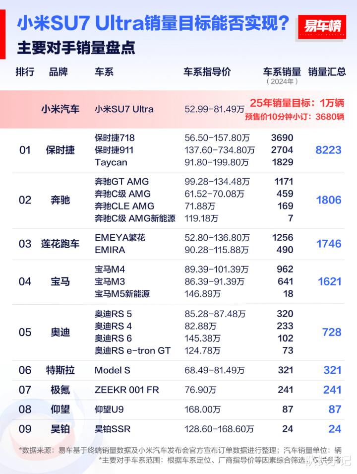 这些都是高性能跑车,包括特斯拉Model S,也只卖了321辆。至于国产的仰望U9、极氪001FR,昊铂SSR,就更加不够看了。可以说,小米SU7 Ultra一出,仰望U9、极氪001FR、特斯拉model S以及昊铂SSR等竞品车型,全都被杀穿了。燃油车里面的保时捷718、奔驰C级 AMG,奥迪RS5等,也都被杀穿了。